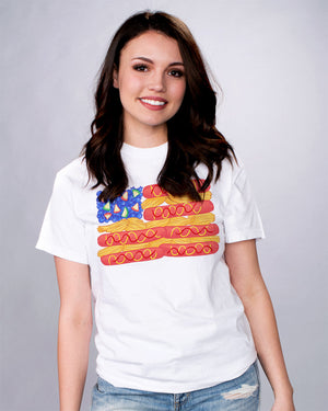 This Cookout Food Flag Shirt is picnic-ready with all the makings of a perfect meal! Show off your culinary style and make a funny statement with hot dogs, chips, and fruit salad in a colorful flag pattern. Put on this creative cookout ensemble and join the celebration!
