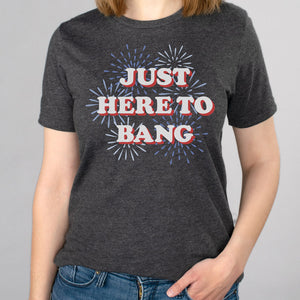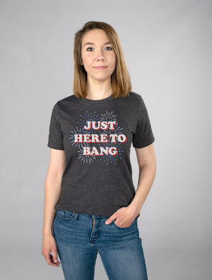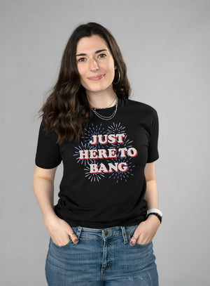 Show off your patriotic spirit with this hilarious bad-boy of a tee! Get ready to make a bang on the Fourth of July with this "Just Here To Bang" t-shirt. Let 'em know you came to party!