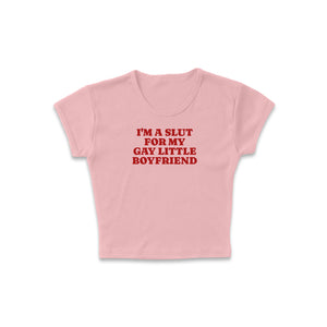 Declare your devotion with just the right amount of sass in our "I'm a slut for my gay little boyfriend" baby tee. This flattering, flirty slightly cropped top is made for bold babes who love loudly and unapologetically. Soft and irresistibly cheeky—just like your relationship.