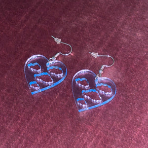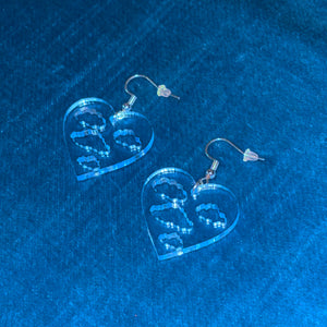 Our handmade, unique heart-shaped earrings are made with beautiful blue fluorescent cast acrylic! The light blue hue is color-shifting in different levels of light and is transparent. These earrings are not solely blue, despite the way they look in photos sometimes.