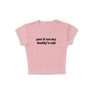 Step up your style game with our "Put it on My Daddy's Tab" graphic baby tee. This playful and cheeky shirt is perfect for those who love to mix a little sass with their fashion. Made from super-soft, high-quality cotton, it offers ultimate comfort and a relaxed yet fitted fit. Whether you're out with friends, hitting the town, or just lounging around, this baby tee adds a touch of humor and personality to any outfit.