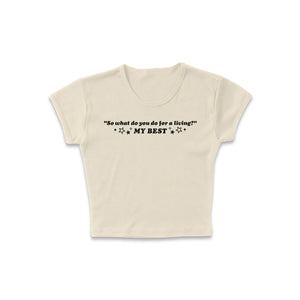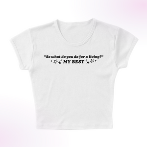This ultra-soft, fitted baby tee is perfect for those who love a playful yet stylish look. Featuring the bold statement "So what are you doing for a living?" in a sleek graphic print, it’s a fun conversation starter with a touch of attitude. Made from breathable cotton with a flattering fit, it’s a must-have for casual outings or layering with your favorite pieces.
