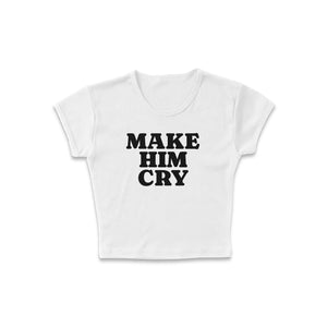 Turn heads and make a statement with our "Make Him Cry" graphic baby tee. This edgy and empowering shirt is perfect for those who aren't afraid to show their fierce and confident side. Crafted from soft, high-quality cotton, it ensures a comfortable fit for all-day wear. Whether you're out with friends, at a concert, or just running errands, this tee adds a touch of boldness and attitude to your outfit. Pair it with your favorite jeans or a leather skirt for a standout look that speaks volumes.
