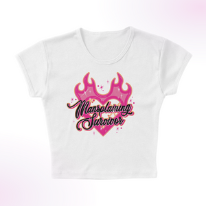 Showcase your humor and resilience with this edgy graphic baby tee. Featuring the cheeky phrase, "Mansplaining Survivor," this top is perfect for those who have triumphed over unsolicited explanations and lived to tell the tale. Ideal for casual wear, social events, feminist rallies, or any place where a sense of humor is appreciated. Celebrate your survival with style and wit in this unique graphic tee.