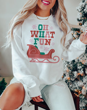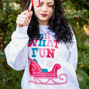 Be the life of the winter party when you rock this Oh What Fun Sleigh Sweatshirt! This cute, retro Christmas sweatshirt will make sure you're standing out from the crowd, while still keeping you cozy and warm. Get ready for a season of ho ho laughs!