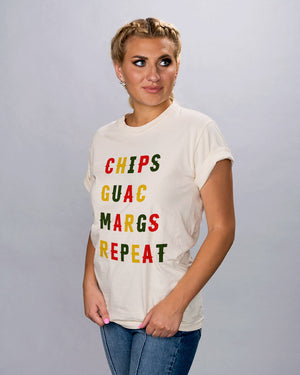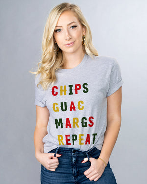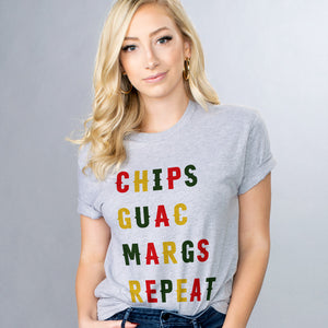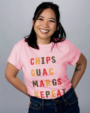 The perfect shirt for your Cinco de Mayo celebrations! This fun "Chips Guac Margs Repeat" design will let everyone know you're about to party hard. Chips, guac, and margs for days!