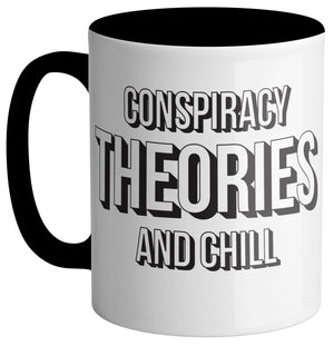 Sip your favorite beverage in this "Conspiracy Theories and Chill" mug! Always ready to discuss the wildest conspiracies, this funny mug is sure to spark up conversations. With its playful design and a sturdy build, you'll be able to enjoy your coffee cup for years to come!