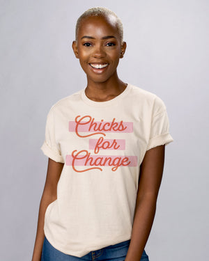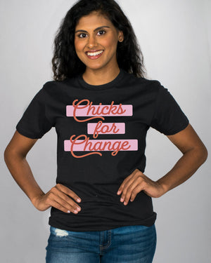 You'll be ready to rock the revolution with this Chicks For Change shirt! Show off your feminist side, declare your commitment to changing the world, and look trendy doing it - it's a win-win-win!