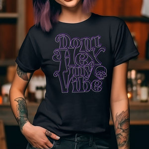 Ward off the unwanted attention with this witchy-funny, "Don't Hex My Vibe" tee. You'll be the envy of your coven with this stylish, 100% cotton top. Now go ahead and channel your inner witch – hex the haters!