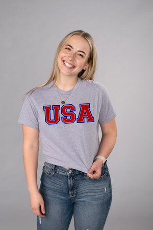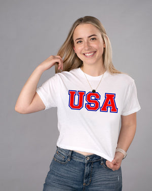 Show your American pride with this classic USA crop tee. With a varsity-style shirt, you'll look cool and stylish while expressing your patriotism! Get ready to rock it on the 4th!