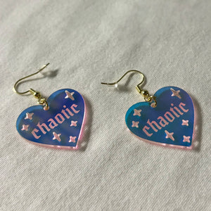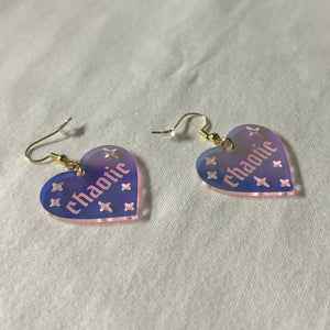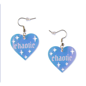 Our handmade, unique heart-shaped earrings are made with beautiful iridescent frosted acrylic! The iridescent hue is color-shifting in different levels of light and is transparent, with a matte finish on one side. These earrings have a captivating visual affect, that adds an elevated look.