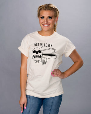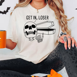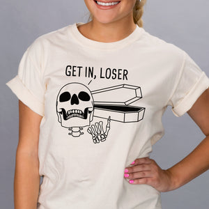 Show everyone that you’re ready to party in the afterlife with this ‘Get In Loser’ Coffin graphic tee! Perfect for your Halloween shenanigans, this spooky tee will make sure you stand out from the undead crowd. It’s time to live..err, uh die?..your best life!