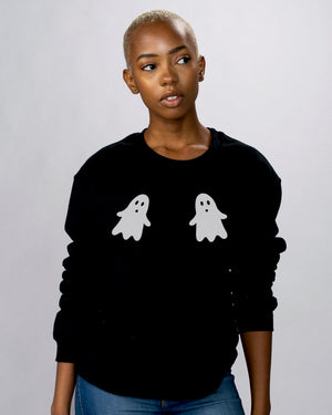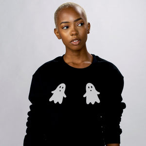 Feeling spooky and flirty. Wear this funny graphic halloween sweatshirt to your next holiday party to rock the latest boob shirt trend.