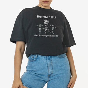 Perfect for Halloween and beyond, this tee combines the spooky charm of a haunted house with the funky vibes of a never-ending disco. Whether you're hitting up a Halloween bash or just want to add some flair to your wardrobe, this tee is your ticket to endless fun. Perfect for those who love a mix of spook and funk, this tee ensures you stay stylish and comfortable, no matter where the night takes you. Get ready to dance with the ghosts and keep the grooves going all night long!