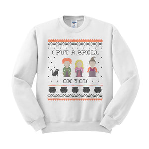 Ah, Hocus Pocus! We could gush forever about how much we love this 90s classic! We have created a design to pay homage to our favorite witches! This Hocus Pocus inspired design features Winifred, Mary, Sarah, Thackery Binx, and cute little black cauldrons. Halloween would not be complete without you, Sanderson Sisters! Wear this one of a kind design this Halloween and cross your fingers for a sequel!