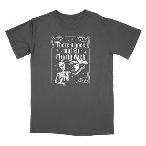 Perfect for those who embrace a carefree attitude with a spooky twist. This tee is crafted from premium, soft-touch cotton, ensuring a comfortable fit that's perfect for any Halloween occasion. The design features a humorous and bold graphic of a flying bat, symbolizing that last 'fck' taking off, paired with a cheeky caption. Ideal for Halloween parties, casual outings, or just lounging around, this shirt is sure to be a hit. Make a statement this spooky season and let everyone know you're all out of 'fcks' to give with this unique tee!