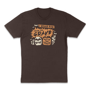 For the eternally tired and dramatically over it — our 'I Would Rise From the Grave But I’m Exhausted' graphic tee speaks for your soul (and your sleep schedule). Made from ultra-soft cotton, it’s the perfect cozy tee for spooky season naps, lazy fall days, and canceling plans in style. Whether you’re haunting the couch or just emotionally unavailable, this tee keeps things cute, creepy, and so relatable. Because even the undead need rest.