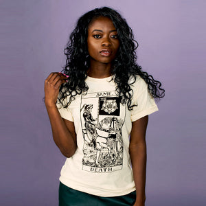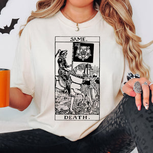 Ready to channel your inner witchy vibes? Then this Same Death Tarot Card Shirt is the perfect addition to your wardrobe! Featuring a cool-as-can-be design, this theater-inspired cotton T-shirt is the ultimate way to show off your unconventional style. Make a death-ly statement in style!