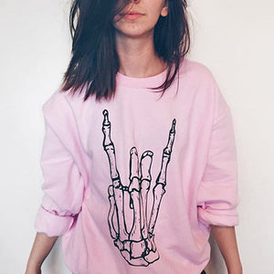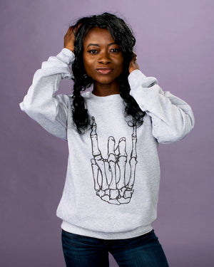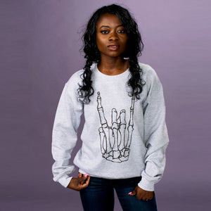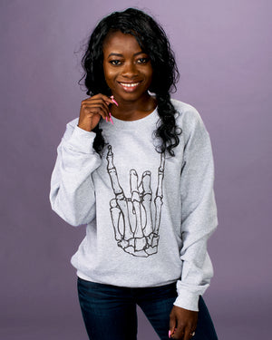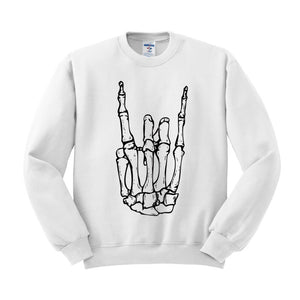 Rock on at an insane concert in this skeleton rock hand graphic top. Perfectly paired with black jeans and sneakers to create the best concert outfit.