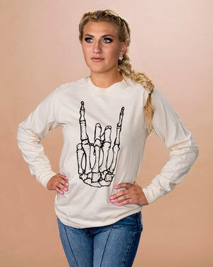 Rock on at an insane concert in this skeleton rock hand graphic top. Perfectly paired with black jeans and sneakers to create the best concert outfit.