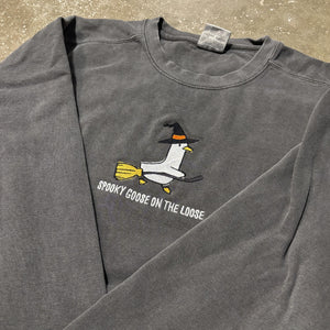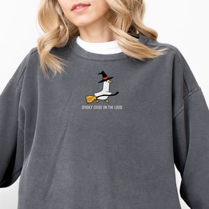 Get in the Halloween spirit with our 'Spooky Goosey' Embroidered Sweatshirt. Featuring a playful witchy goose design, this cozy sweatshirt is perfect for adding a touch of spooky fun to your autumn wardrobe. Made from ultra-soft, high-quality fabric, it offers a relaxed fit that's perfect for layering or wearing on its own.