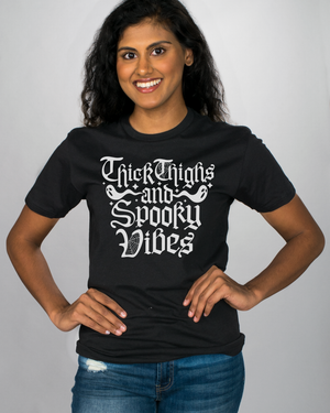 Take your Halloween style to the next level with this super-cute “Thick Thighs and Spooky Vibes” shirt! Show off your curves and your wicked style in one fabulous top – it’ll be the buzz of the season! (Boo-yah!)