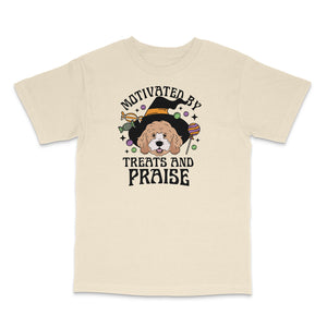 This cute halloween tee features an adorable golden doodle dog decked out in Halloween gear, proudly proclaiming their love for treats and praise. Perfect for dog lovers and Halloween enthusiasts alike, this tee is a fun and festive way to show off your holiday spirit. Made from soft, breathable fabric, it ensures comfort while keeping you stylish during all your Halloween adventures.