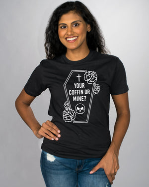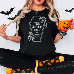 Dress up your spooky side with this frightfully funny "Your Coffin Or Mine" shirt. It's the perfect way to show your Halloween spirit, whatever your style.