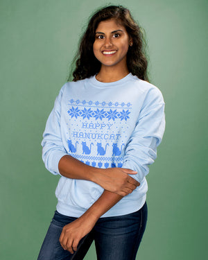 Happy Hanukkah! Time to celebrate the Festival of Lights and your love for kitties! This ugly Hanukkah sweater features a faux cross stitch pattern with dreidels, snowflakes, and of course cats!
