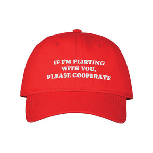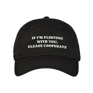 Make a statement with our playful embroidered dad hat that says, "If I'm Flirting with You, Please Cooperate." Crafted from high-quality cotton twill, this hat combines humor and style for the perfect casual accessory. Whether you're dropping hints or just keeping it fun, this hat does the talking for you. Wear it to your next boozy brunch, out and about at the bars, or just chilling at home with friends.