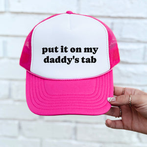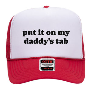 Add a touch of sass and humor to your wardrobe with this playful trucker hat. Featuring the cheeky phrase, "Put It on My Daddy's Tab," this hat is perfect for those who love to make a bold and humorous statement.