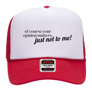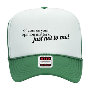 Rock your sass with this trendy trucker hat that reads, "of course your opinion matters, just not to me!" Perfect for those who love a bold statement and a bit of fun. With a classic mesh back and adjustable snap closure, it offers both comfort and attitude. Make a statement without saying a word!