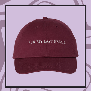 Take your office sarcasm to the next level with our ‘Per My Last Email’ embroidered dad hat. Perfect for anyone who’s mastered the art of professional shade, this hat lets you carry your email energy into the real world. Comfy, adjustable, and subtly sassy, it’s the ideal accessory for when you want to make a point—without saying a word. Because sometimes, your hat says it all.