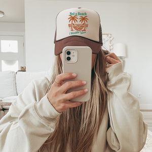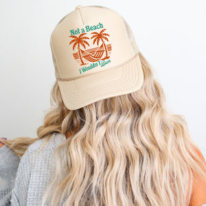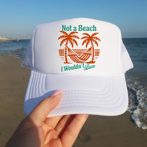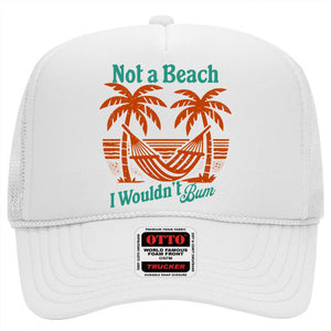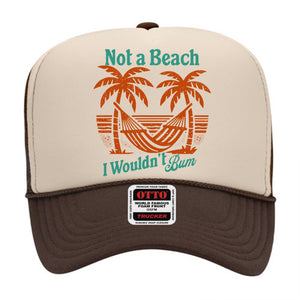 Top off your look with our stylish trucker hat featuring the slogan, "Not a Beach I Wouldn't Bum." With this fun and carefree slogan, this trendy hat is perfect for beach lovers and sunseekers. With its breathable mesh back, it ensures comfort and style for all your seaside adventures.