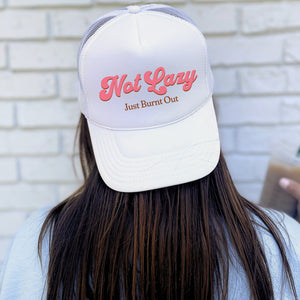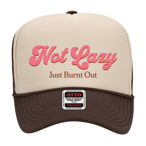 Show off your honest and relatable side with this stylish trucker hat. Featuring the witty phrase, "Not Lazy, Just Burnt Out," this hat is perfect for those who work hard and know the value of taking a break. Embrace the hustle and remind everyone that taking a breather is totally okay with this unique and playful trucker hat. Whether you're out with friends or just need a day off, this hat is sure to make a statement and bring a smile to those around you.