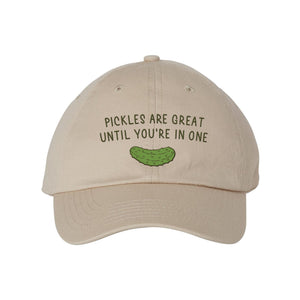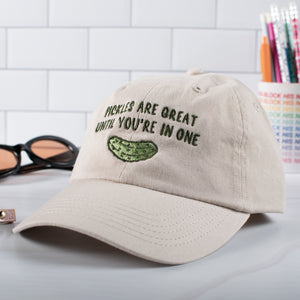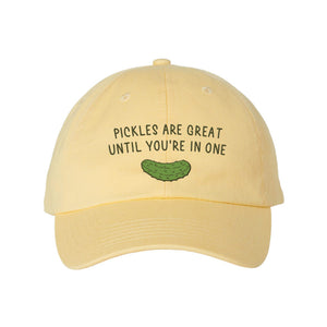 Stay out of sticky situations with a hat that says it all. Our 'Pickles Are Great Until You’re in One' embroidered dad hat brings a playful twist to everyday dilemmas. With its fun and quirky design, this hat is perfect for adding a bit of humor to your casual look. Whether you're a pickle lover or just avoiding trouble, this cap has you covered.