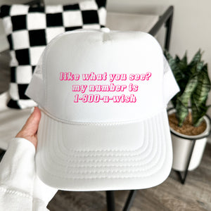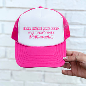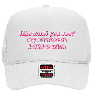 Turn heads and add a touch of sass to your outfit with this playful trucker hat. Featuring the cheeky phrase, "like what you see? my number is 1-800-u-wish," this hat is perfect for those who love to make a bold statement with their style. Ideal for casual outings, beach trips, festivals, or just adding some attitude to your everyday look.