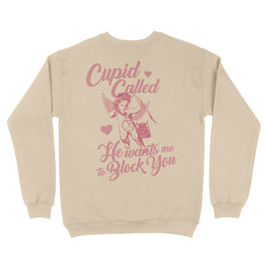 Cupid called, and he’s over it—just like you are. Our “Cupid Called, He Wants Me to Block You” crewneck sweatshirt brings the perfect mix of sass and vintage vibes. With its dainty design and bold message, this ultra-soft pullover is made for turning heads and dropping hints. Pair it with ripped jeans or leather leggings for a look that says, “I’m cute, cozy, and unbothered.” Block the drama, keep the style.