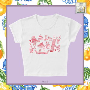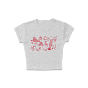Celebrate la dolce vita with our 'Italian Doodles' women’s baby tee—playful, artsy, and full of Mediterranean charm. Featuring hand-drawn illustrations like pasta, gelato, and espresso, this soft tee is perfect for adding a little Italian flair to your everyday look. Casual, cute, and effortlessly chic—just like a stroll through an Italian piazza.