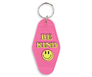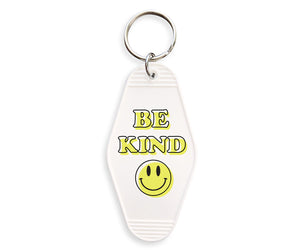 Unlock your inner '90s kid with this cheerful Be Kind Smiley Motel Keychain! Show off your attitude with this chunky plastic smiley face and give your keys some retro-cool swagger. A fun and quirky gift for anyone in need of a pick-me-up!