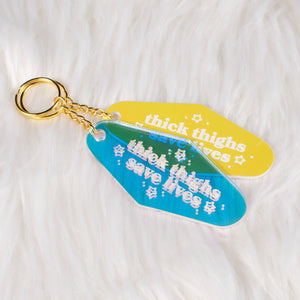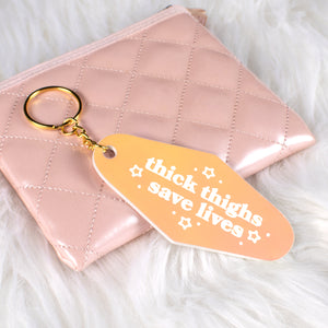This uniquely designed 'Thick Thighs' Iridescent Motel Keychain offers a fusion of creativity and craftsmanship, sure to capture attention and evoke smiles wherever it's seen. Crafted from lightweight acrylic, this keychain features an intricate design meticulously cut with our in-house laser engraving machine.
