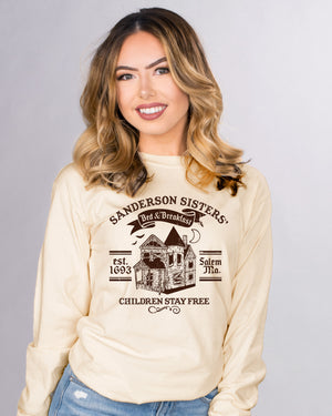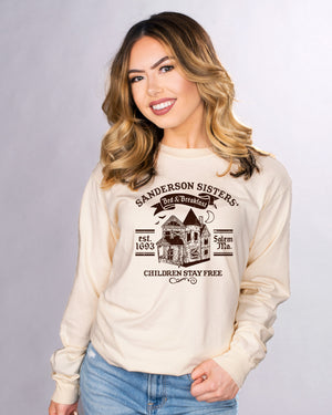 It's time to check in to the coziest B&B in town! Our Sanderson Sisters B&B Long Sleeve Tee is seriously stylish and spooky - perfect for adding a bit of witchy flair to any outfit. With a comfy fit and magical design, this shirt will have you feeling like you've just stepped into Hocus Pocus! (You better start brushing up on your spells!)