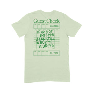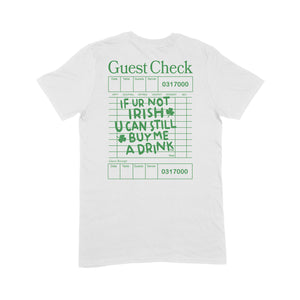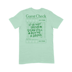 Celebrate St. Patrick’s Day in style with this trendy guest check design that says “If Ur Not Irish, U Can Still Buy Me a Drink” printed on the back of the tee. Featuring a playful design and crafted from ultra-soft fabric, this tee brings a chic touch to festive celebrations. Perfect for pairing with denim or your go-to green accessories, it’s an effortless way to mix sass and style for the season.