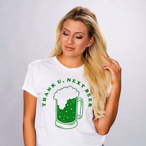 Show off your leprechaun attitude in this hip and festive shirt! Get your shamrocks ready - it's time to party! Get your hands on this "Thank U, Next Beer" shirt and show everyone that you're ready to celebrate St. Patrick's Day in style!