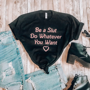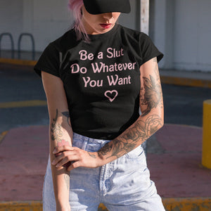Take a stand against slut shaming in this eye-catching 'Be A Slut' shirt! With a sassy yet oh-so-powerful slogan, this shirt will let the world know you believe in being yourself and not conforming to societal expectations. Embrace your uniqueness and show off your confidence - no more apologizing for being you!