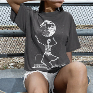 This hauntingly hilarious dancing skeleton shirt is sure to spook up your wardrobe! Get ghoulishly groovy with this spooky babe, perfect for any fan of the paranormal.