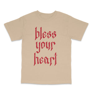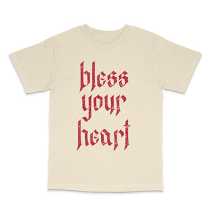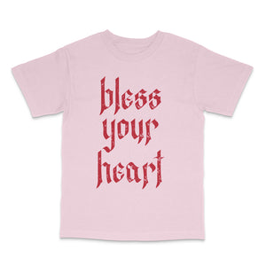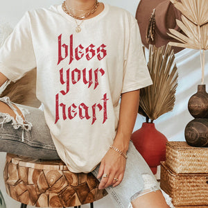 Make a bold statement this Valentine’s Day with a gothic "Bless Your Heart" graphic tee that blends dark style with edgy romance. Perfect for those who love alternative aesthetics with a sarcastic twist, this tee stands out while staying effortlessly wearable. A unique Valentine’s gift for her or anyone who loves sarcastic humor.