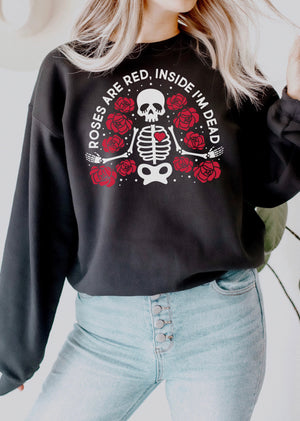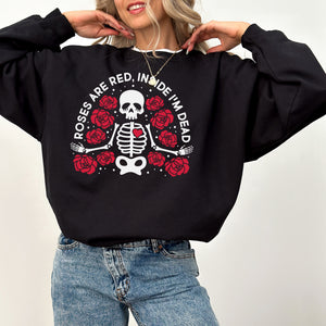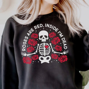 Raise the dead with this punny and playful anti-Valentine's Day sweatshirt! Perfect for anyone who's feeling a bit 'meh' about the holiday, this fashionable garment features a message that says "roses are red, but inside I'm dead." Let everyone know you're in no rush to join Cupid's parade.