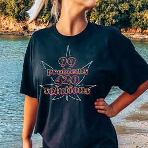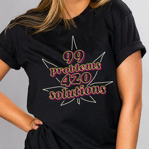 Don't let the problems of daily life bog you down - hit 'em with 420 Solutions! This funny shirt features a weed-inspired spin on the classic saying, and is sure to get you some laughs. Show off your humorous side with this must-have for all 420 enthusiasts.
