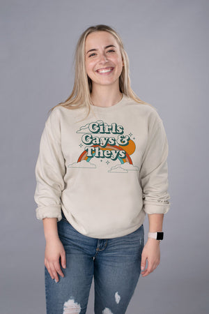 Show off your queer colors in this cute and cozy crewneck! This Girls Gays and Theys Sweatshirt is perfect for expressing your all-encompassing love, no matter how you identify! Make a difference and look snazzy doing it.